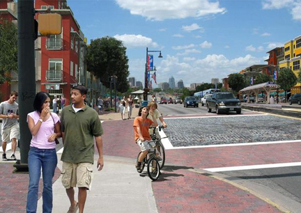 A rendering from the City of Austin represents how East Riverside Drive might look with a mix of businesses and residences in low-rise buildings with wide, shaded sidewalks, bike paths and other improvements.