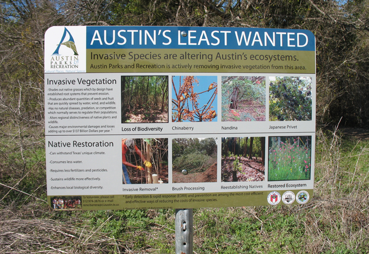 To learn why Austin Parks Foundation removes invasive plants, read their Ecological Restoration website. Find out how to identify invasive plants in the Austin area with the Grow Green program’s Invasive Plants pdf.