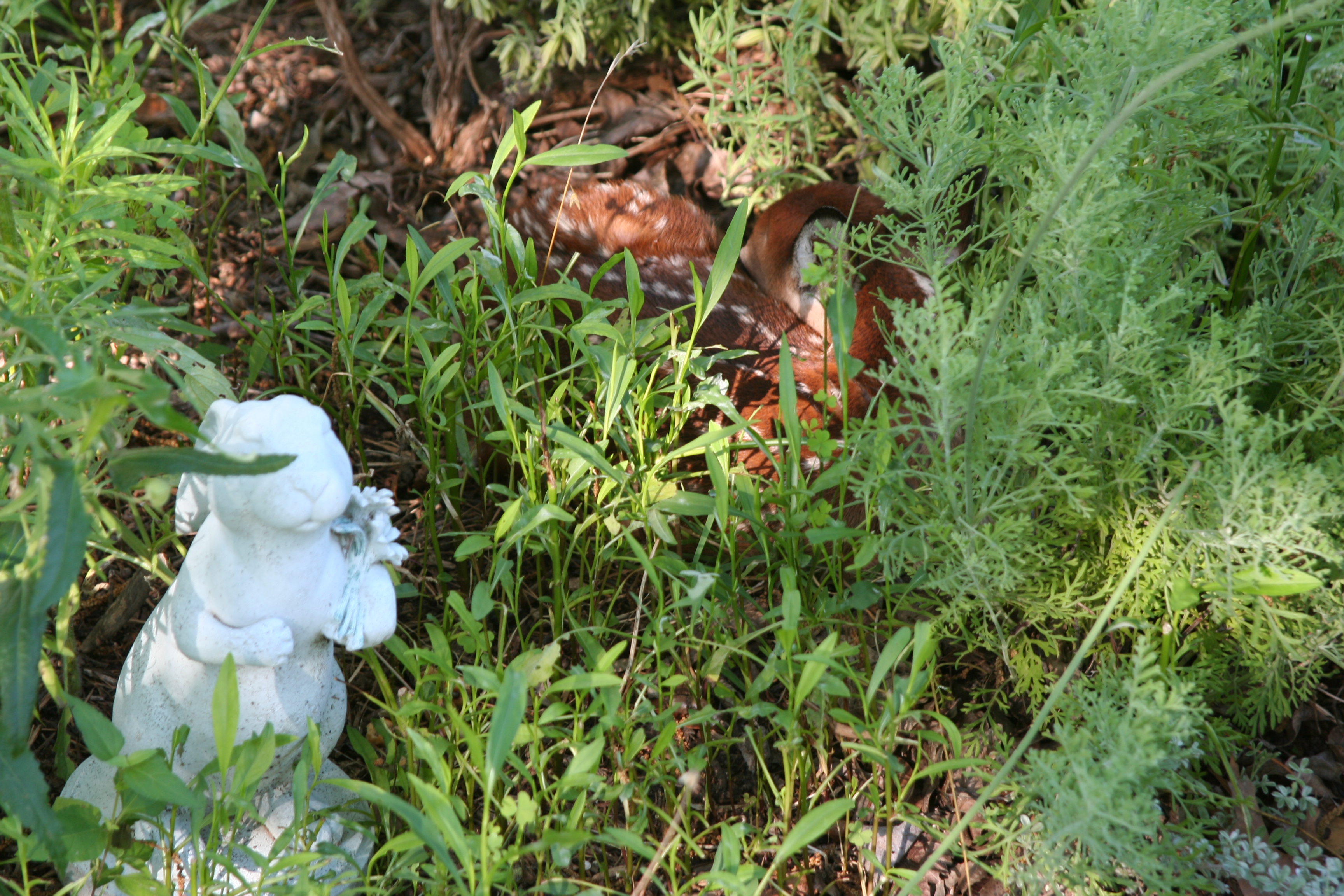 A fawn was barely as big as an ornamental bunny in one yard on Princeton Drive when it was a few days old. It hid in tall landscape plants each day while its mother went in search of food and rest.